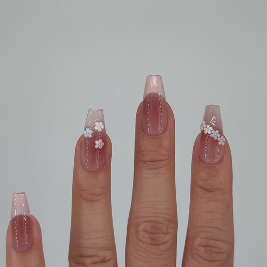 Apply glue to your press-ons and your natural nail. Press firmly for 30 seconds per nail with pressure to ensure full adhesion.